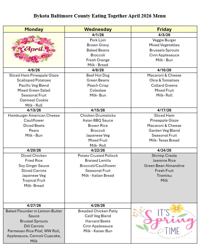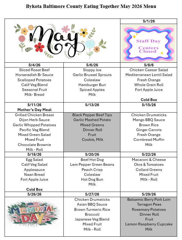 The Eating Together Program is supported through the Older American’s Act and allows qualified participants to make a voluntary, anonymous donation of any amount. The minimum recommended donation amount is $4.00. These donations allow the program to remain sustainable